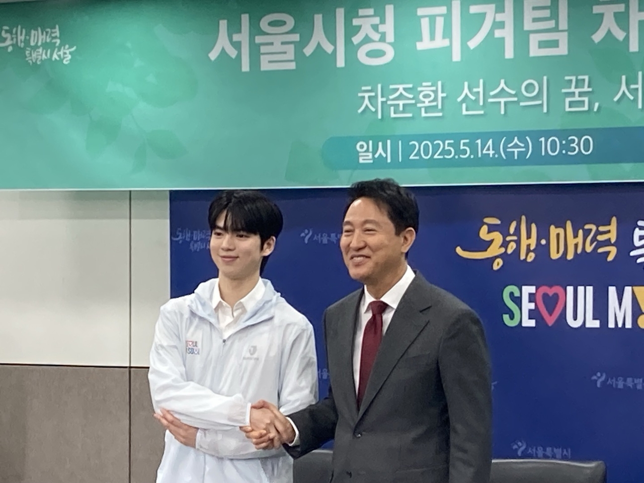 이날 입단식에서 오세훈 서울시장은 차준환에게 유니폼을 입혀주며 서울시청 소속이 된 차준환의 입단을 환영하고 새로운 출발을 응원했다.
