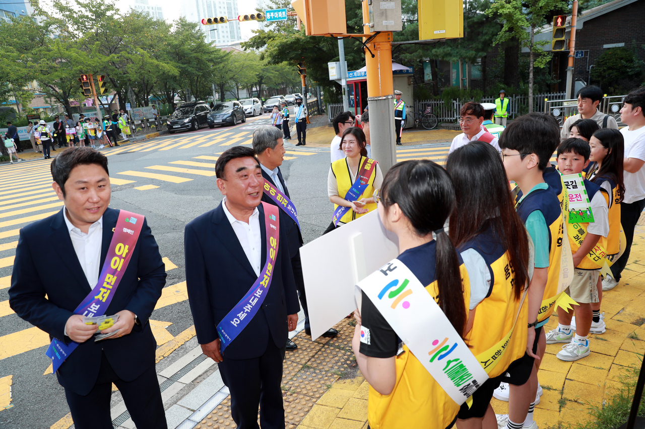 | 울산시가 어린이보호구역 교통사고 등 시민들의 사고에 대해 피해를 보상해주는 사업을 시행한다. 사진은 김두겸 울산시장(왼쪽에서 두 번째)이 어린이 교통안전캠페인 나선 모습 [울산시 제공] |