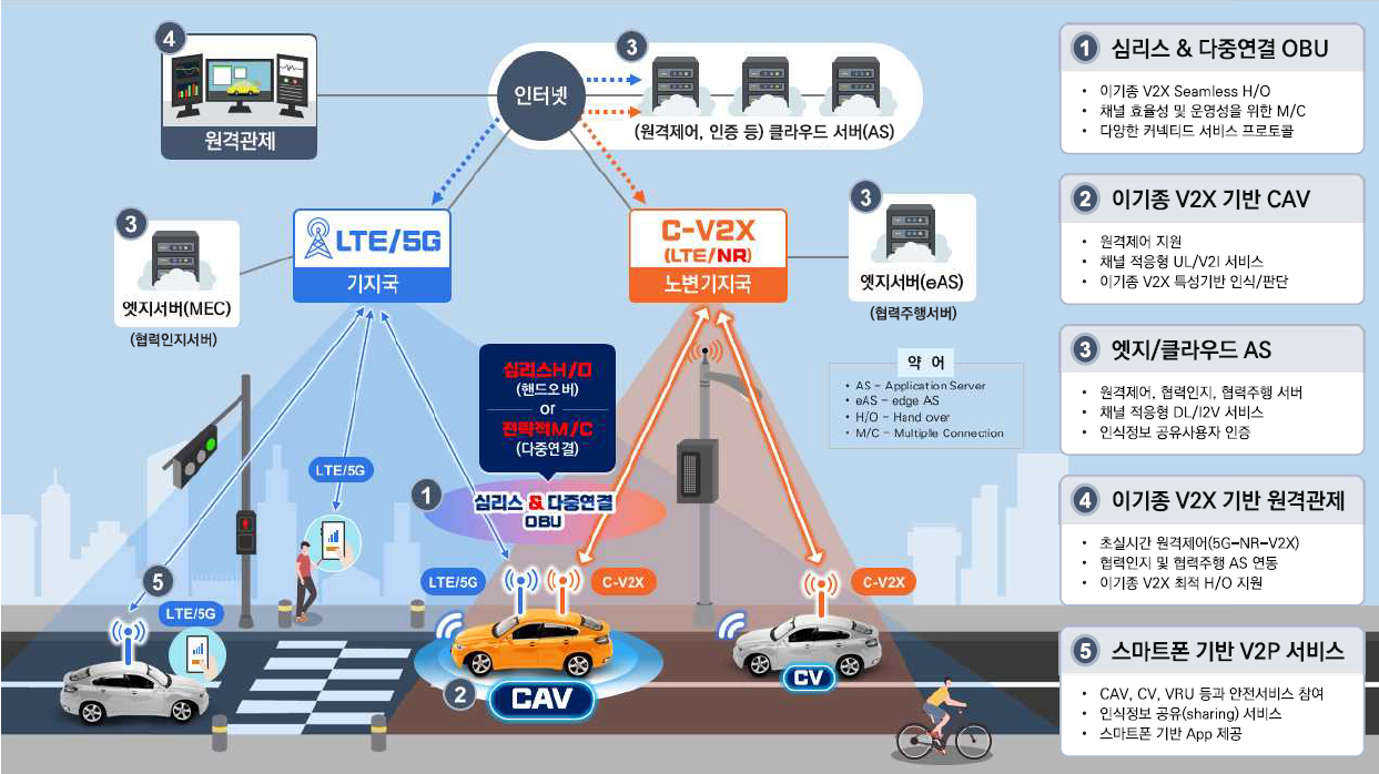 또한 주요 개발 결과물로는 ▷이(異)기종 네트워크 간 끊김 없는 서비스를 제공하는 통신장치(OBU) ▷이(異)기종 네트워크 기반 자율주행시스템 ▲자율협력주행서비스를 위한 엣지/인프라 서버 ▷원격관제 시스템 ▷보행자와 일반차량용 애플리케이션 개발 등이 있다.