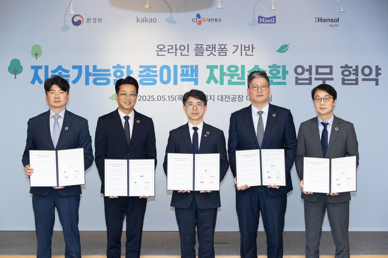 [헤럴드경제=이태형 기자]환경부는 카카오, CJ대한통운, 매일유업, 한솔제지와 15일 대전시 대덕구 한솔제지 대전공장에서 종이팩 회수율을 높이기 위해 ‘온라인 플랫폼 활용 종이팩 회수 시범사업 업무협약’을 체결했다고 밝혔다.