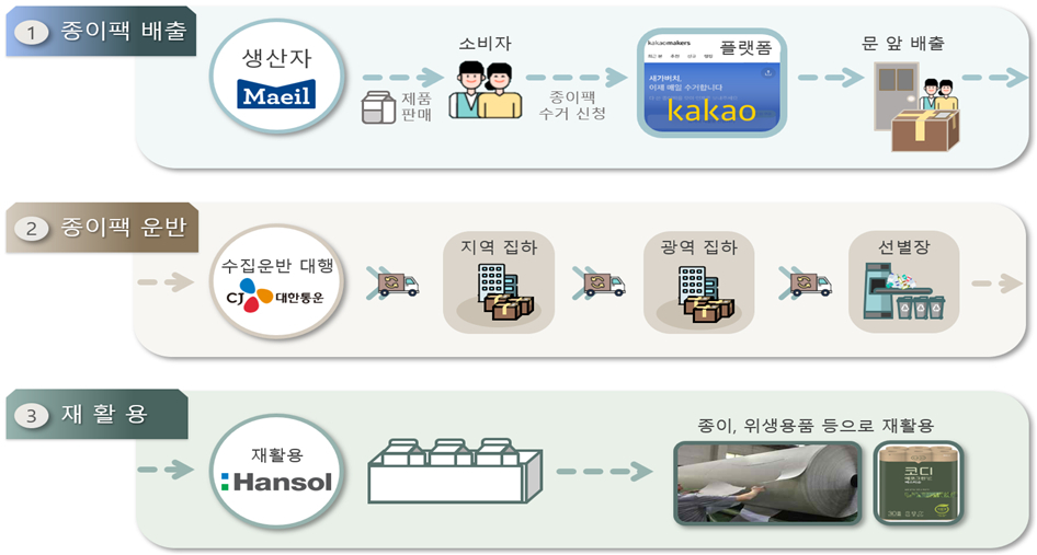 매일유업은 회수 참여자에게 자사 제품 구매 시 할인쿠폰을 제공해 참여유인을 제공하는 한편 한솔제지는 회수된 종이팩을 고품질의 종이로 재활용해 종이팩 회수 선순환 체계 구축을 지원한다.