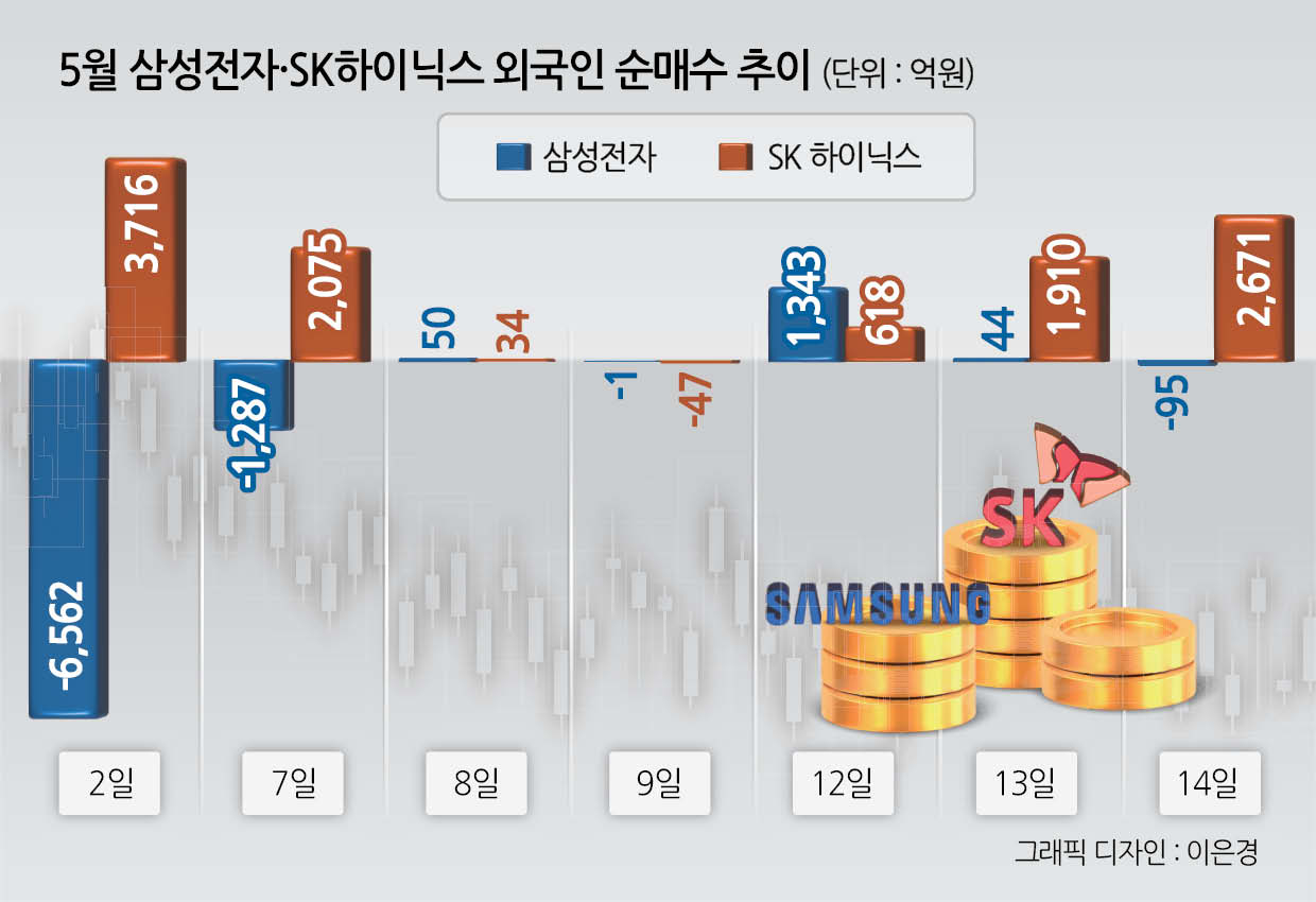 엔비디아가 사우디아라비아에 최신 인공지능(AI) 칩을 공급하기로 했다는 소식이 전해지면서 국내 반도체주가가 들썩였다. 외국인은 이달 들어 SK하이닉스를 1조원 순매수하면서 엔비디아 납품 여부에 따라 투자심리가 갈렸다.