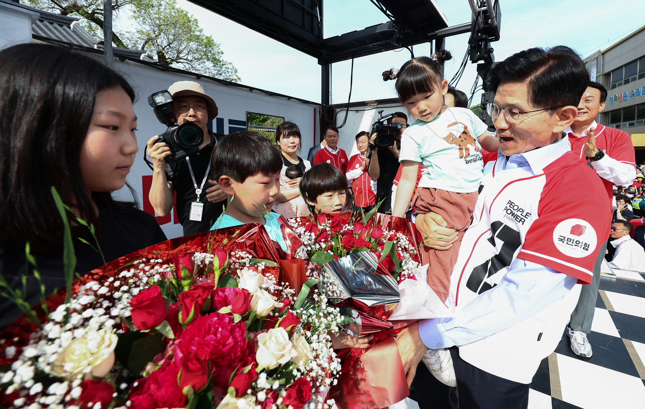 | 국민의힘 김문수 대선 후보가 14일 경남 밀양시 밀양관아 앞에서 열린 유세에서 정용우, 손정혜 씨의 육남매 자녀들에게 꽃을 전달 받고 있다.[공동취재·연합] |