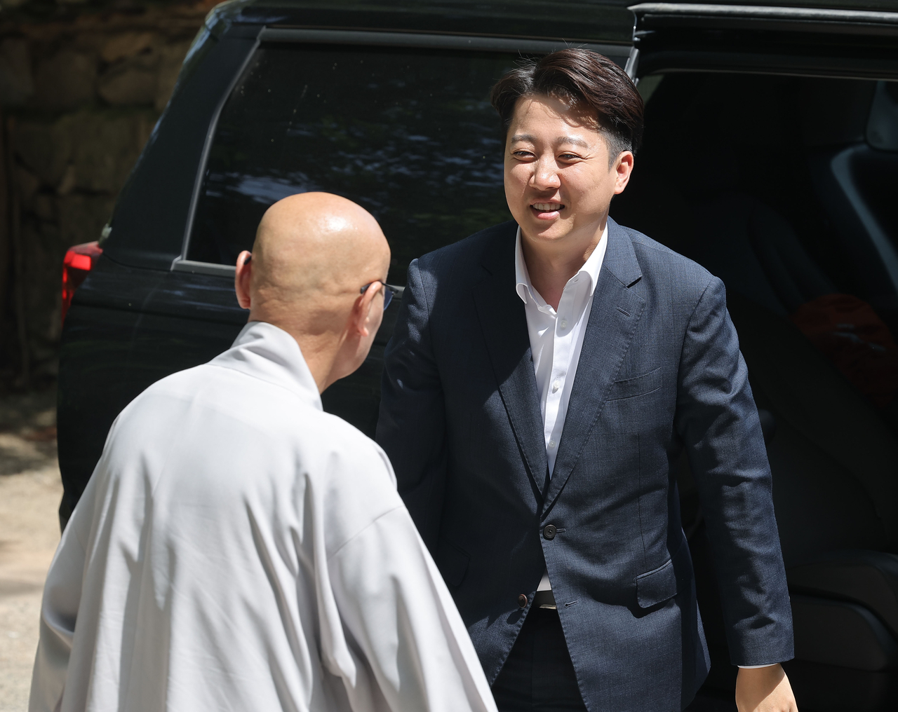 | 이준석 개혁신당 대선후보가 지난 14일 부산 금정구 범어사 안양암에 도착해 인사하고 있다. [연합] |