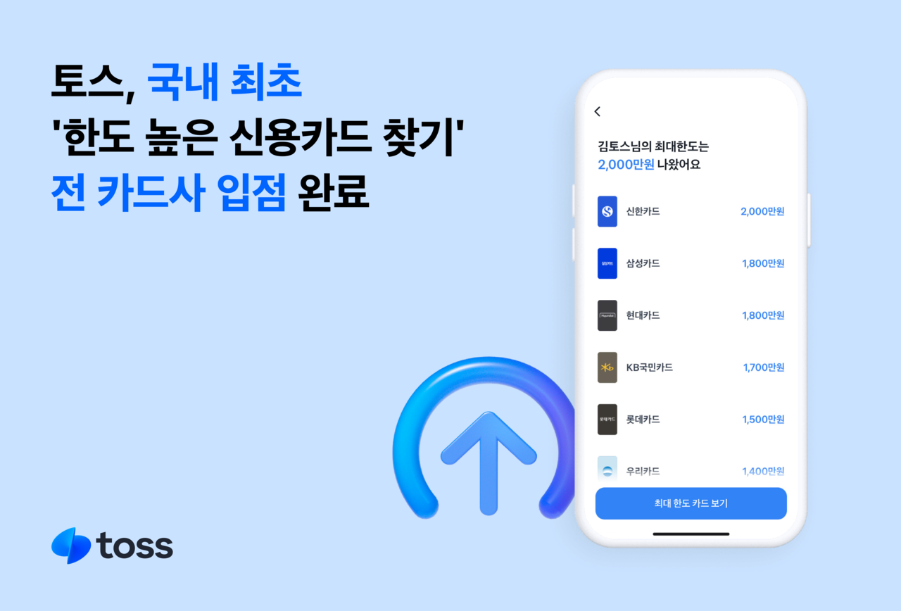 [헤럴드경제=정호원 기자] 토스는 국내 최초로 주요 8대 전업계 카드사 모두가 참여하는 ‘한도 높은 신용카드 찾기’ 서비스를 제공한다고 15일 밝혔다. 이번에 BC카드가 추가됨에 따라, 주요 8개 전업 카드사의 161개 신용카드를 대상으로 발급 가능 여부와 한도를 비교할 수 있게 됐다.