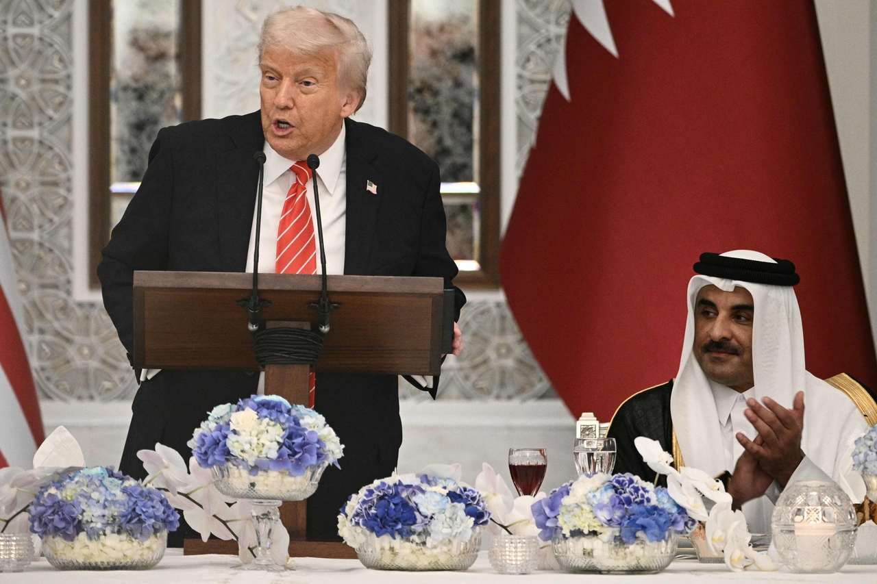| 도널드 트럼프 미국 대통령이 14일(현지시간) 카타르에서 국빈 만찬 중 발언하고 있다. [AFP} |