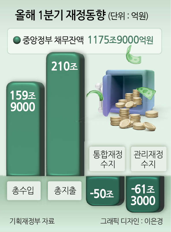 관리재정수지가 적자를 낸 건 들어온 세금보다 나간 돈이 더 많기 때문이다. 1분기 총수입은 전년 동기 대비 12조5000억원 증가한 159조9000억원, 총지출은 2조2000억원 감소한 210조원을 나타냈다. 총수입에서 총지출은 뺀 통합재정수지는 50조원 적자를 기록했다. 여기서 사회보장성 기금 수지 흑자를 제외한 게 관리재정수지다.
