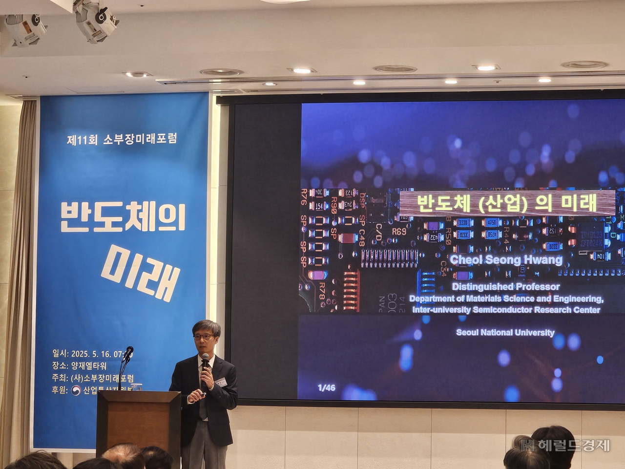 | 황철성 서울대 재료공학부 석좌교수는 16일 서울 강남구 양재엘타워에서 개최된 ‘제11회 소부장미래포럼’에서 한국 반도체의 미래에 대해 발표하고 있다. 김민지 기자 |
