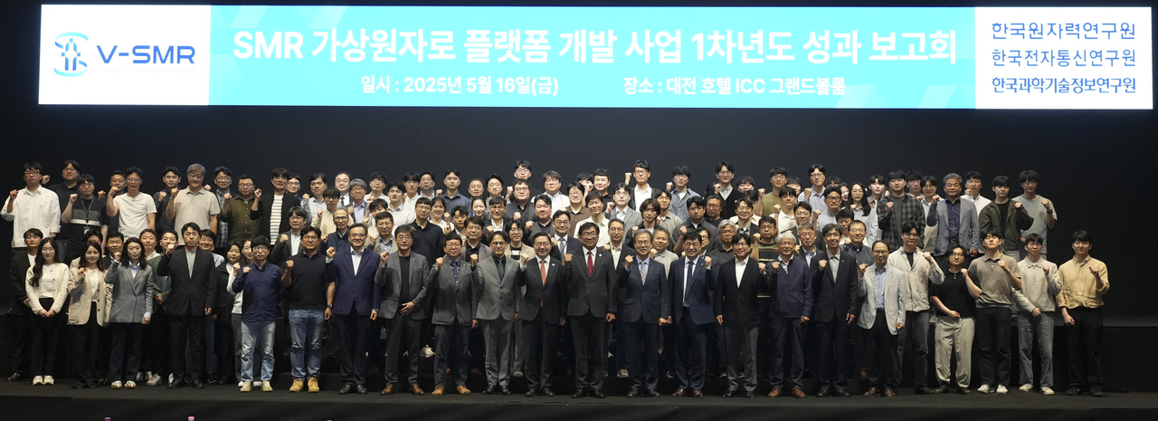 | 16일 열린 SMR 가상원자로 플랫폼 개발 사업 1차년도 성과보고회 참석자들이 기념촬영을 하고 있다.[한국원자력연구원 제공] |