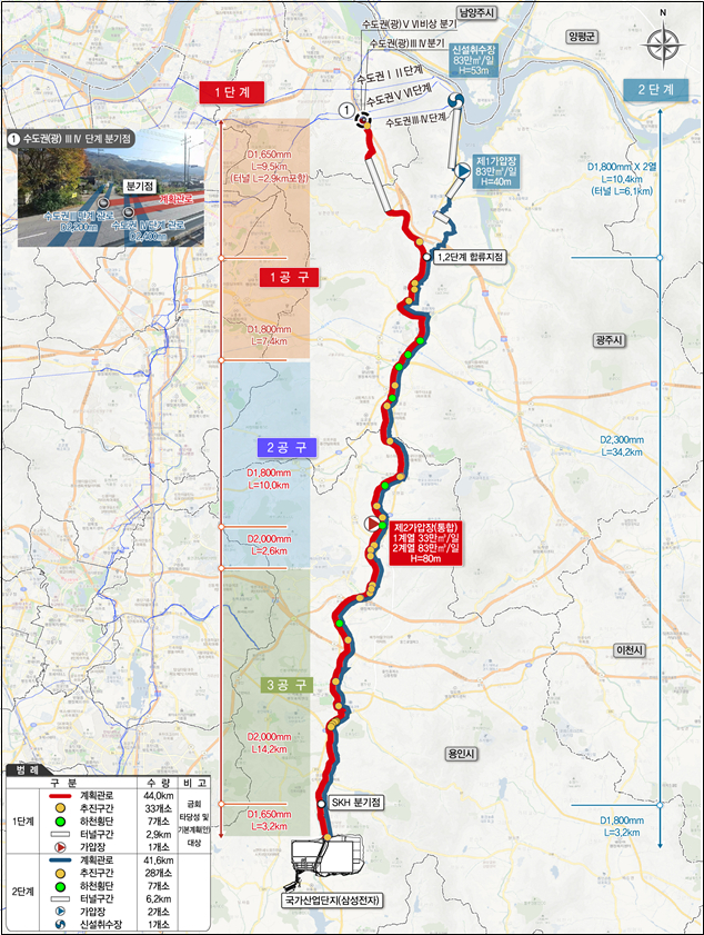 1단계 사업은 팔당댐에서 반도체 산단까지 총 46.9㎞의 전용 관로와 가압장 1곳을 신설하는 것이 골자다. 기본구상(2024년 6월), 타당성 조사(2024년 7월~2025년 2월) 등의 절차를 거쳐 최적 노선을 반영할 예정이다. 사업비는 총 8432억원이 투입된다.