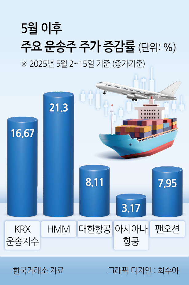 16일 한국거래소에 따르면 KRX 운송지수는 5월 상승률(15일 기준) 16.67%를 기록했다. KRX 운송지수는 국내 해운사인 HMM과 팬오션, 대한항공과 아시아나항공과 같은 항공 기업 등으로 구성돼 있다.