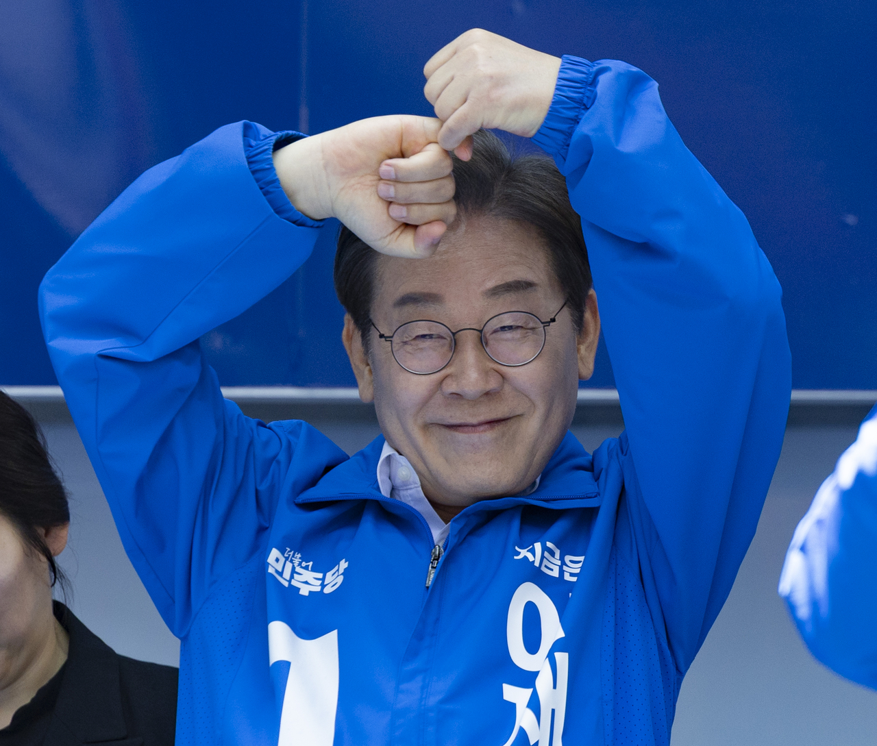 | 더불어민주당 이재명 대선후보가 14일 부산 부산진구 서면에서 열린 유세에서 부산을 위한 공약을 말한 뒤 약속을 지키겠다는 새끼 손가락 걸기 포즈를 하고 있다. <연합> |
