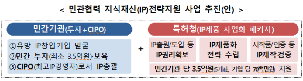| * 1개 민간기관 당 지식재산(IP)창업기업 5개사 발굴 및 민간투자금 3.5억원(최소) + 특허청 3.5억원 매칭. |