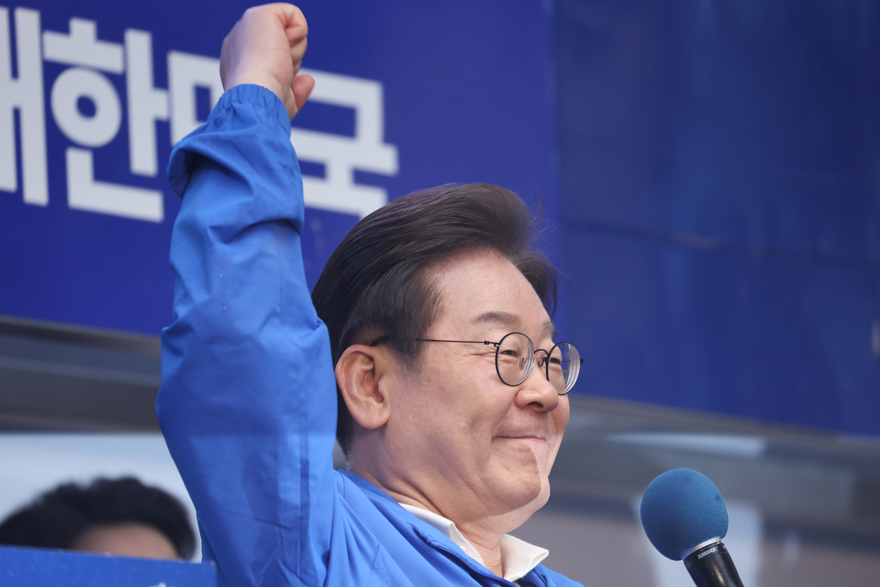 | 더불어민주당 이재명 대선후보가 15일 전남 순천시 연향동 패션의 거리에서 열린 유세에서 지지를 호소하며 주먹을 쥐어보이고 있다. [연합] |