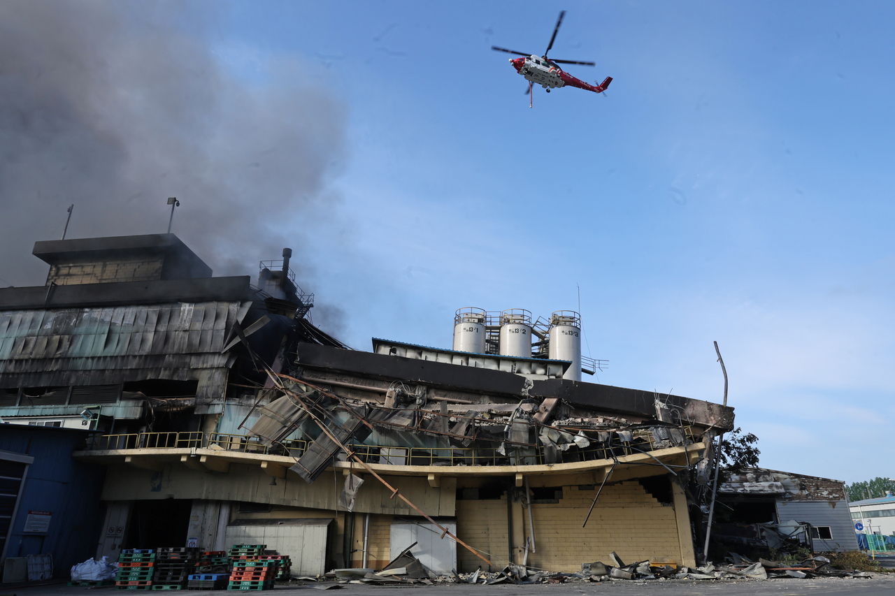 | 금호타이어 광주공장 화재 발생 이틀째인 18일 소방 헬기가 상공을 돌며 불을 끄고 있다. [연합] |