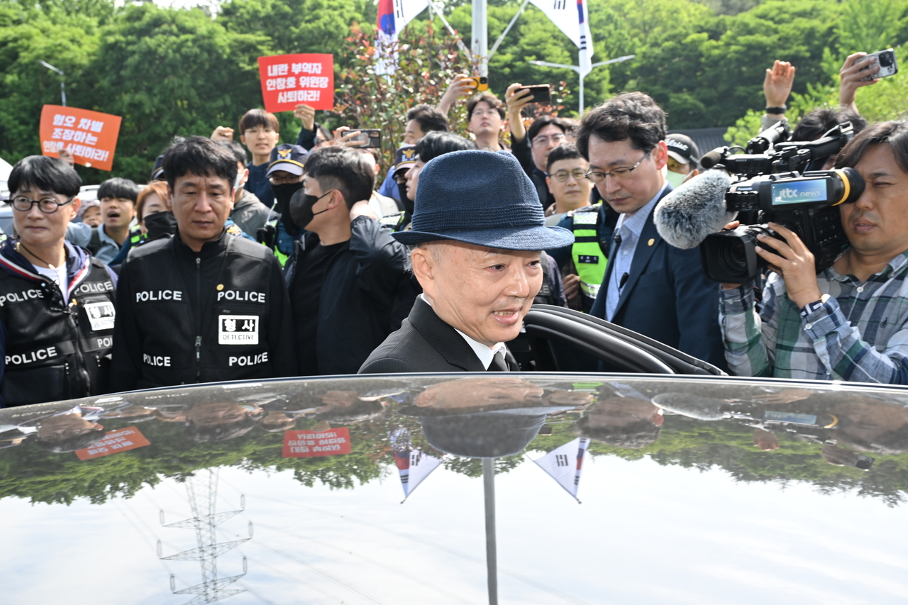 | 제45주년 5·18 민주화운동 기념식이 열린 18일 오전 광주 북구 운정동 국립 5·18 민주묘지 민주의문 앞에서 안창호 국가인권위원장이 시민들의 반발로 기념식장에 입장하지 못하고 돌아가고 있다.[연합] |
