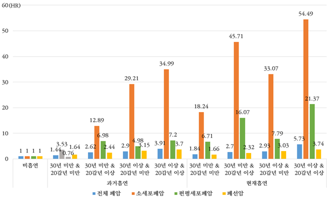 연구 결과, 성별이나 연령, 음주 여부 등 연구 대상자의 일반적 특성이나 폐암·후두암의 유전위험점수가 같을 때 ‘30년 이상, 20갑년 이상’ 흡연자의 경우 비흡연자보다 소세포폐암은 54.49배, 편평세포폐암은 21.37배, 편평세포후두암은 8.30배 발생 위험이 컸다.
