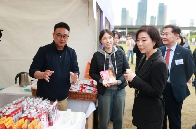 | 오영주 중소벤처기업부 장관이 지난 3일 세종 중앙공원에서 열린 동행축제 개막식에서 판매 부스를 둘러보고 있다.[중기부 제공] |