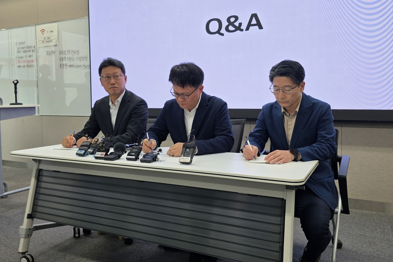 | 김희섭(왼쪽부터) SK텔레콤 PR센터장, 임봉호 MNO사업부장, 류정환 인프라네트워크센터장이 19일 오후 서울 중구 삼화타워에서 열린 일일브리핑에서 취재진의 질문을 듣고 있다. [권제인 기자/ eyre@] |