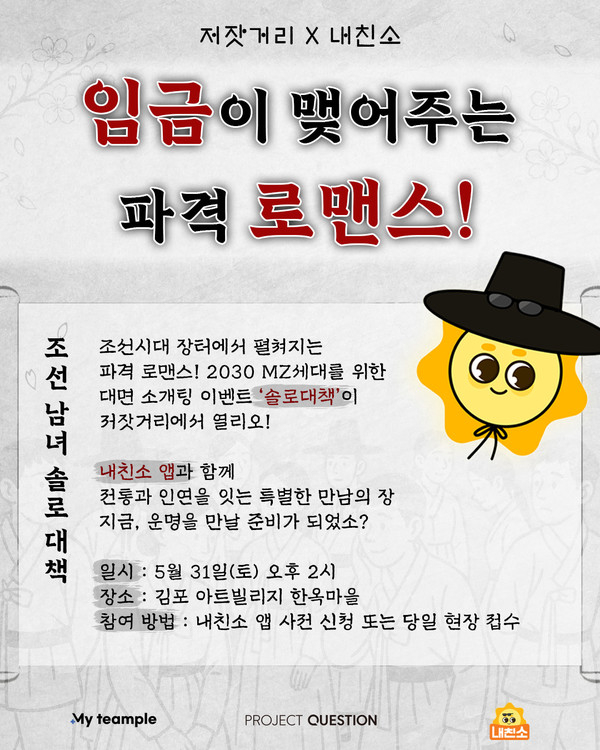 조선시대 장터를 현대적으로 재해석한 전통공예 마켓 축제 ‘저잣거리 세 번째 이야기 – 김포 저잣거리’에서 이색 만남 이벤트 ‘솔로대책’을 선보이는 것이다. 소셜 플래닝기업 프로젝트퀘스천이 기획했으며, 31일(토) 오후 2시, 김포 아트빌리지 한옥마을 내 시전상인 구역 무대에서 진행된다.