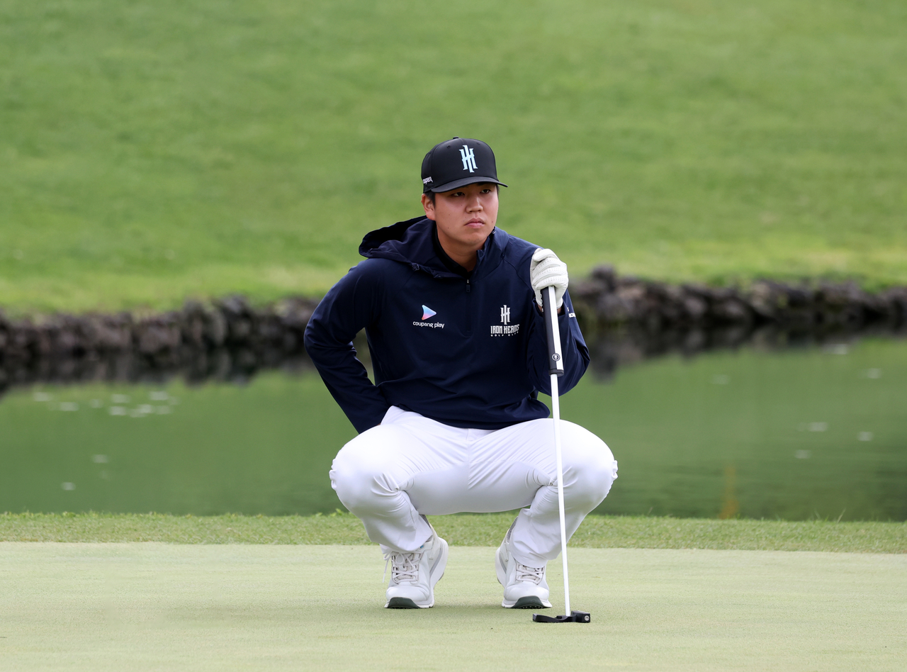 | 장유빈이 18일 제주 서귀포 핀크스GC에서 열린 KPGA 투어 SK텔레콤 오픈 2라운드에서 새롭게 바꾼 퍼터를 들고 그린을 살피고 있다. [KPGA 제공] |