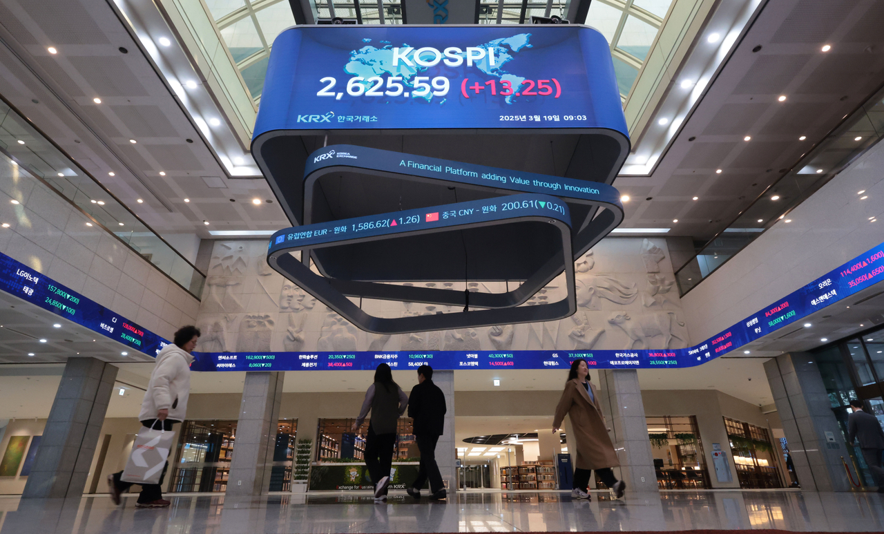 | 지난 3월 19일 서울 영등포구 여의도 한국거래소 현황판에 코스피 지수 등이 표시되고 있다. [연합] |