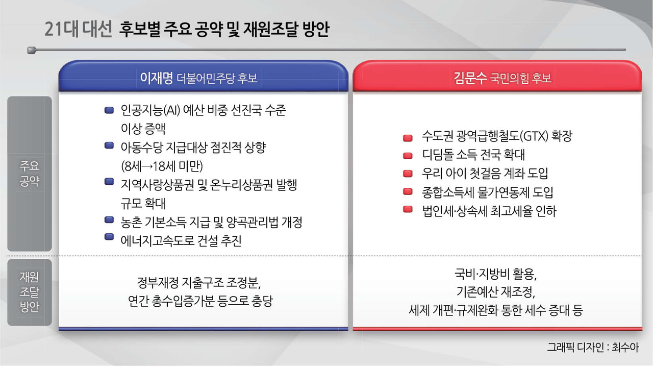 구상에는 차이를 보이지만 결국엔 대규모 재정 투입을 통해 경제를 살리겠다는 얘기다. 공약을 지키려면 재정 뒷받침이 있어야 하는데, 재원을 어떻게 조달할지 구체적인 계획을 밝힌 후보는 한 명도 없다.
