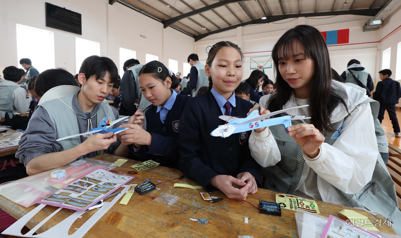 [헤럴드pic] 몽골 학생들과 모형 비행기 조립하는 대한항공-아시아나항공 직원들 글꼴 선택 본문 텍스트 크게본문 텍스트 작게 인쇄 [헤럴드경제(바가노르(몽골))=임세준 기자] 대한항공과 아시아나항공 임직원들이 21일 몽골 울란바타르시 바가노르구에 위치한 군갈루타이 국립학교에서 항공공학 체험 수업을 진행하고 있다. 현지 학생들은 임직원들과 함께 비행기 모형을 만들고 날리며 비행 원리를 배우는 시간을 가졌다. 올해는 대한항공이 아시아나항공을 인수한 이후 양사 임직원이 함께한 첫 현장 봉사로 협력과 나눔의 의미를 더했다.