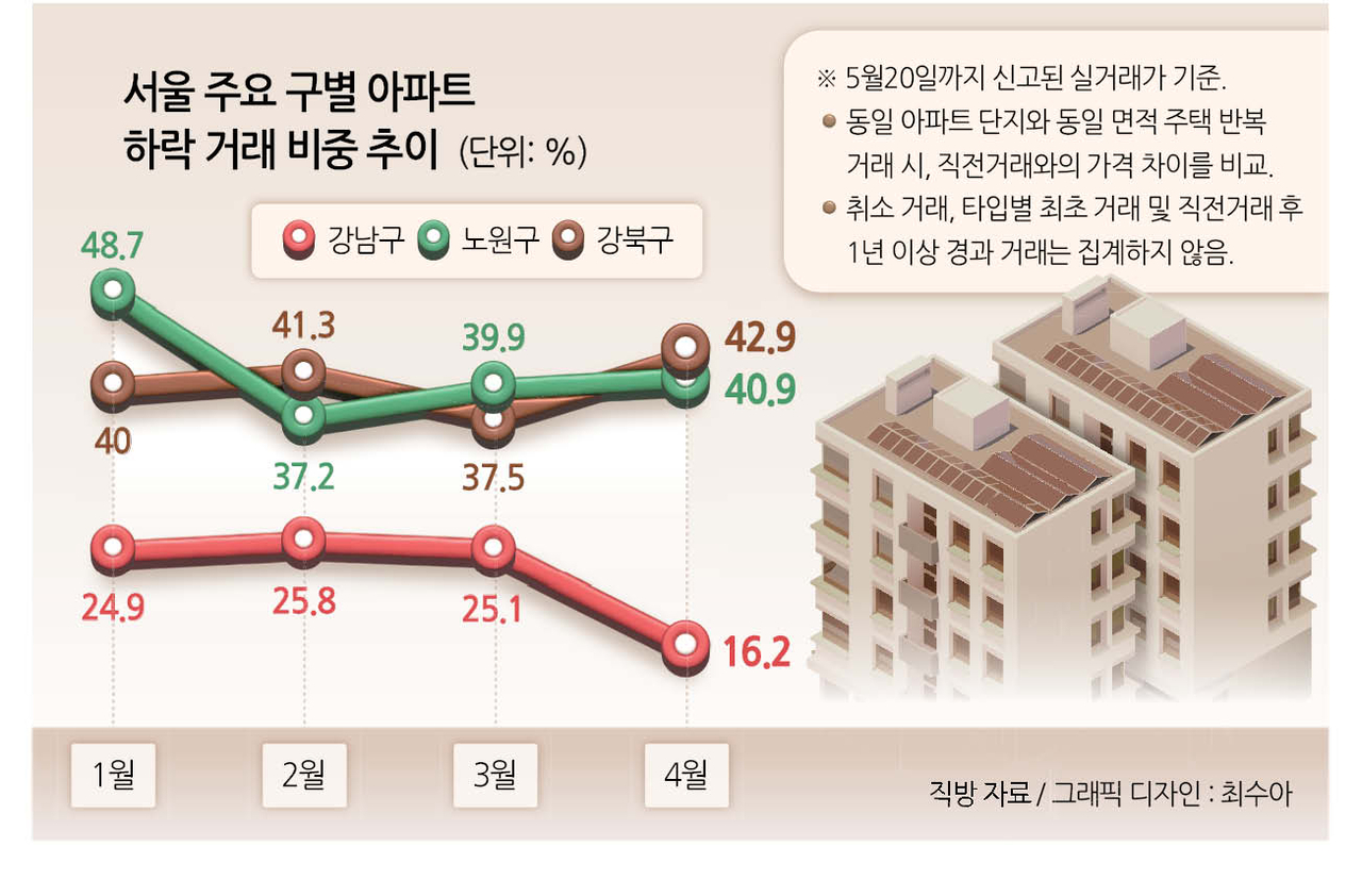 21일 헤럴드경제가 직방에 의뢰해 국토교통부 실거래가 자료를 분석한 결과(20일 집계 기준, %는 하락거래 비중)에 따르면 지난달 강남구(16.2%)·서초구(20%)의 하락 거래 비중은 전달(각각 25.1%, 25.9%) 대비 모두 감소하며 올해 들어 가장 낮은 수준을 기록했다. 반면 종로구(42.9%)·강북구(42.9%)·노원구(40.9%)·성북구(41.6%)·구로구(40.7%)에서는 같은 기간 하락 거래 비중이 되레 증가했다. 이들 지역에서는 아파트 열채 중 네채 이상이 직전 실거래가 대비 낮은 가격에 거래됐다는 의미다.