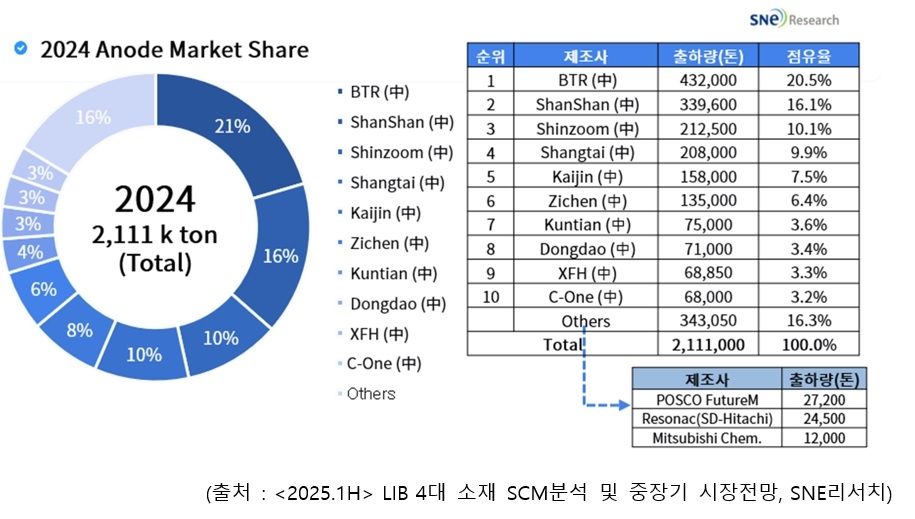 한국과 일본의 음극재 업체들은 지난해 중국 업체들의 과잉 생산과 저가 수주 경쟁에 밀려 고전했다. 포스코퓨처엠은 천연흑연(NG)을 한국 3사에 모두 공급하고 있으며 인조흑연(AG)도 이제 사업을 시작하며 생산능력을 확대하고 있지만, 지난해 전기차 캐즘(일시적 수요정체)으로 인한 수요 둔화 및 미국 정부의 중국산 흑연 음극재 공급 유예 및 중국산 흑연 제품과의 가격경쟁 등의 여파로 고전한 것으로 나타났다.