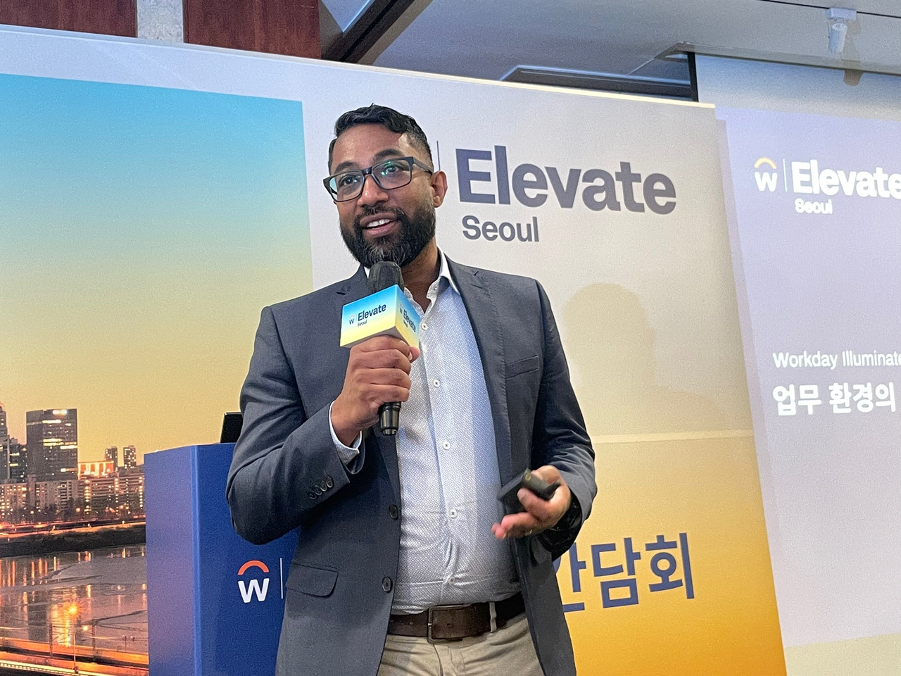 | 샨 무어티(Shan Moorthy) 워크데이 아시아태평양지역 최고기술책임자(CTO)가 22일 서울 송파구 올림픽로 롯데호텔월드에서 열린 ‘워크데이 엘리베이트 서울 2025’에서 발표를 진행하는 모습 [차민주 기자/chami@] |