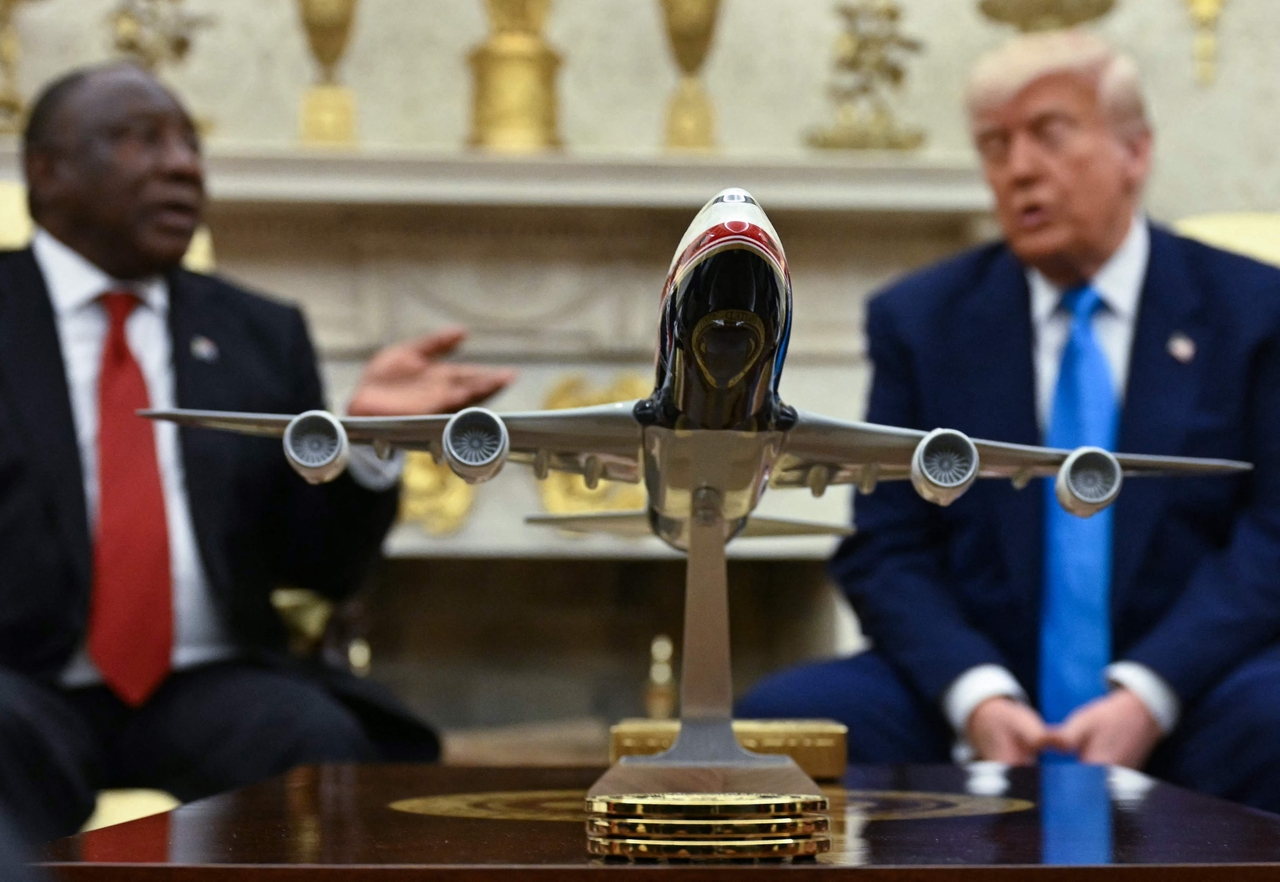 | 21일(현지시간) 도널드 트럼프 미국 대통령이 백악관 집무실에서 시릴 라마포사 남아프리카공화국 대통령을 만나고 있는 가운데 보잉 747 기종 모형이 테이블 위에 놓여 있다. [AFP] |