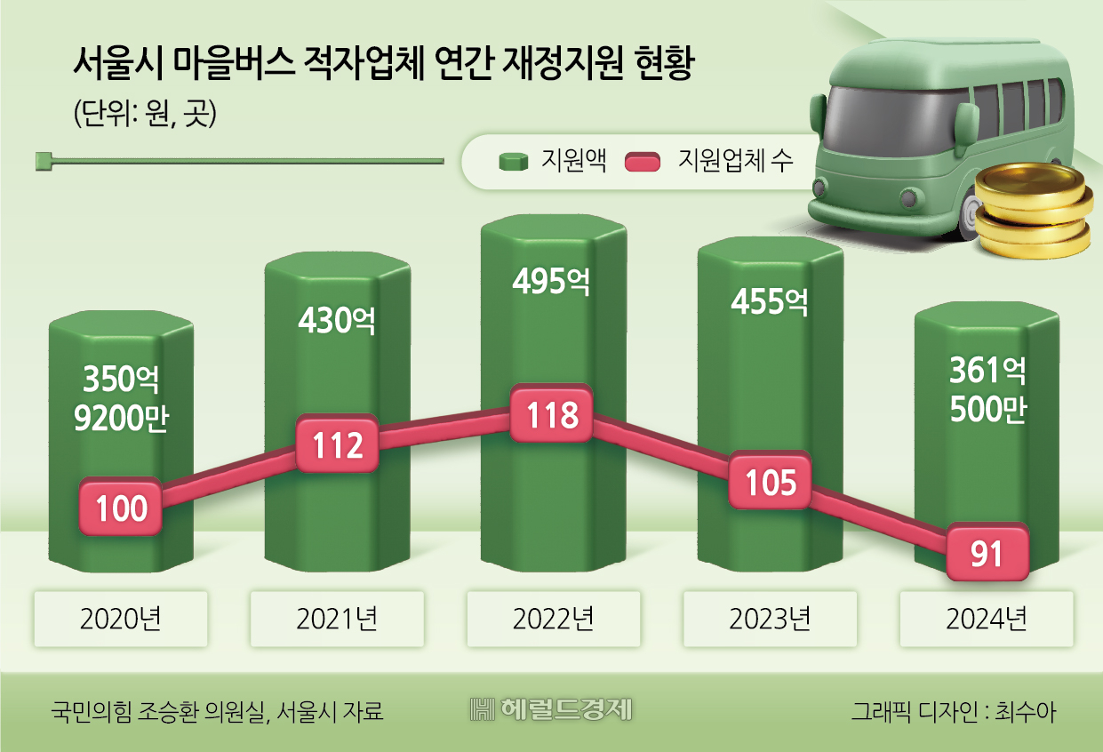 적자 내는 업체가 많아지는 시의 지원금액도 커졌다. 2019년 192억1300만원이던 적자업체 지원액은 코로나19가 불어닥친 그 다음해 350억원대로 불어났다. 2022년 495억원으로 고점을 찍고 2023년(455억원), 2024년(361억원) 내리 줄었지만 서울시는 올해 마을버스 지원 예산을 3년만에 415억원으로 증액했다.