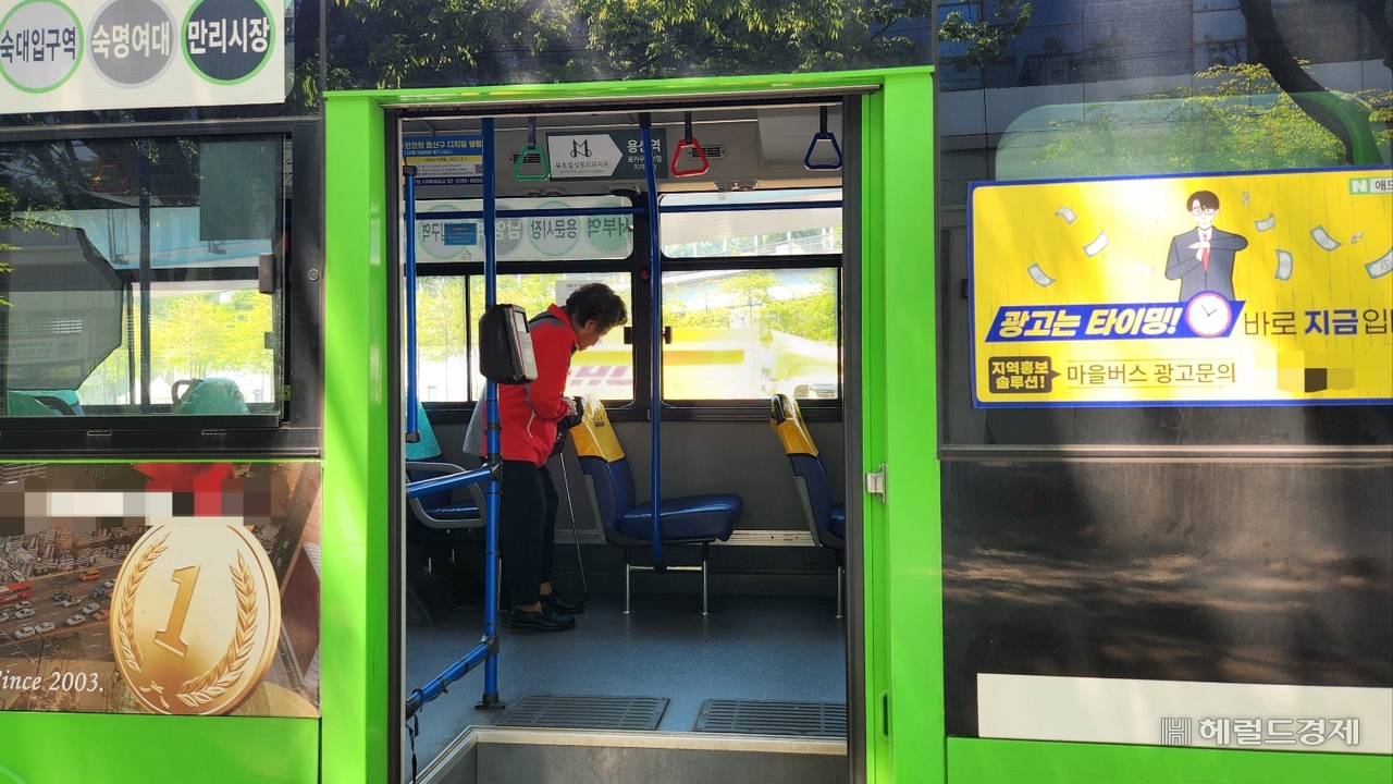 | 80대 노인이 지난 4월 29일 서울 청파동 인근에서 마을버스에 탑승하고 있다. 안효정 기자. |
