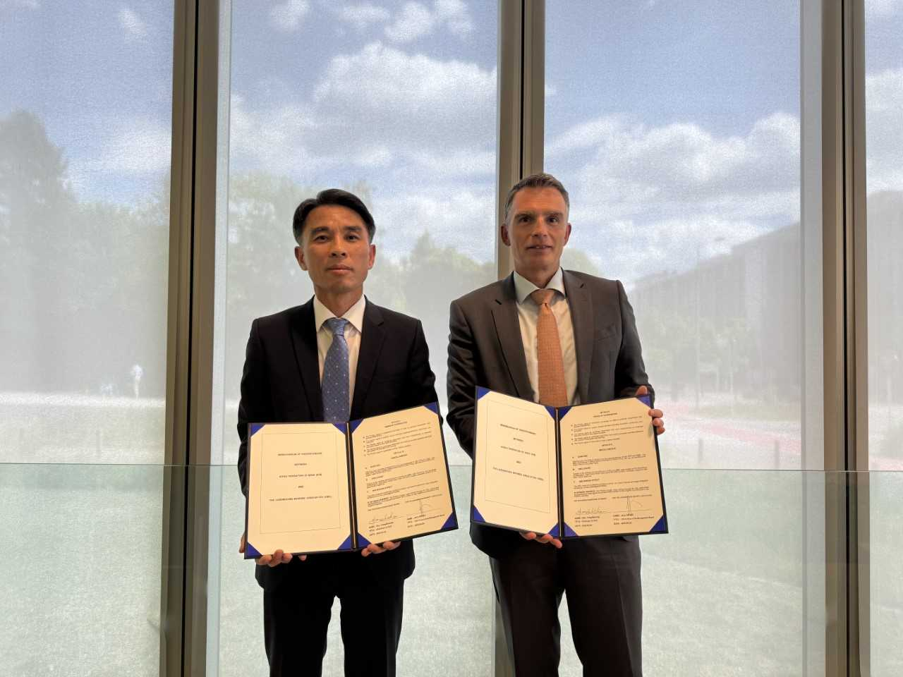 | 이태훈(왼쪽) 은행연합회 전무이사와 제리 그리빅(오른쪽) 룩셈부르크 은행협회 CEO가 양해각서(MOU)를 체결하고 기념사진을 촬영하는 모습. [은행연합회] |