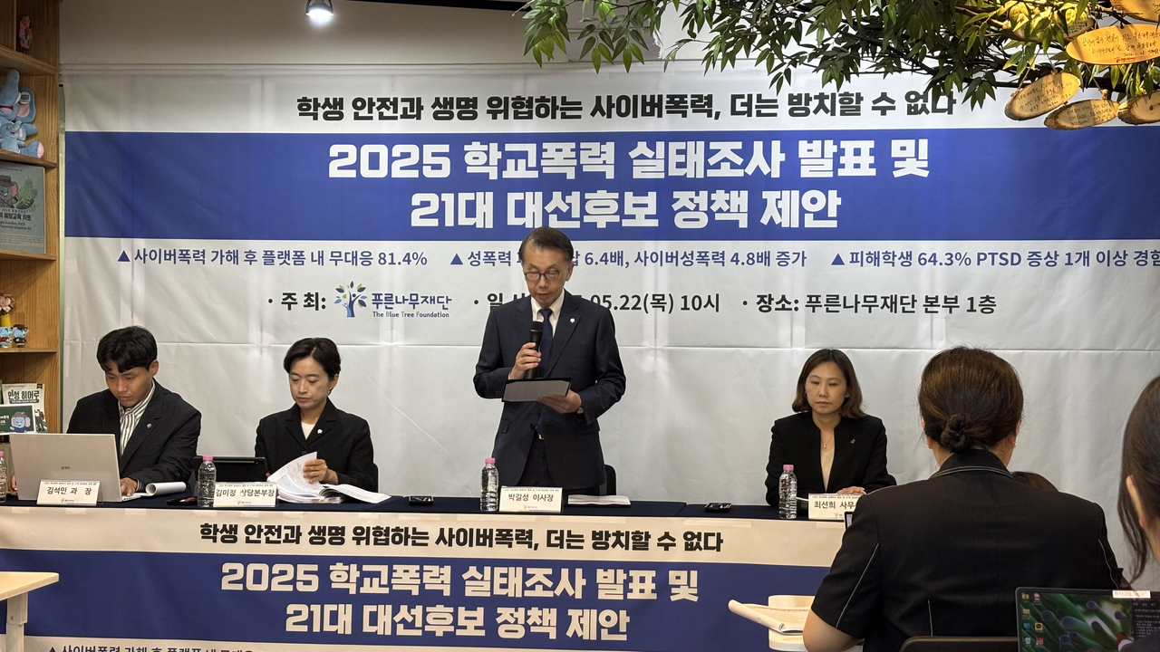 박길성 푸른나무재단 이사장은 “딥페이크 영상 피해자의 70%가 10대이고 폐해는 상상을 넘어섰다”며 “플랫폼 책임 이행 공시제 법제화, AI 기반 사이버 폭력 대응력 강화, 피해 학생 및 가족 중심 통합 지원 체계 지원책 마련 등 학교폭력을 해결하기 위한 정책을 제21대 대선 후보들에게 제안한다”고 했다.