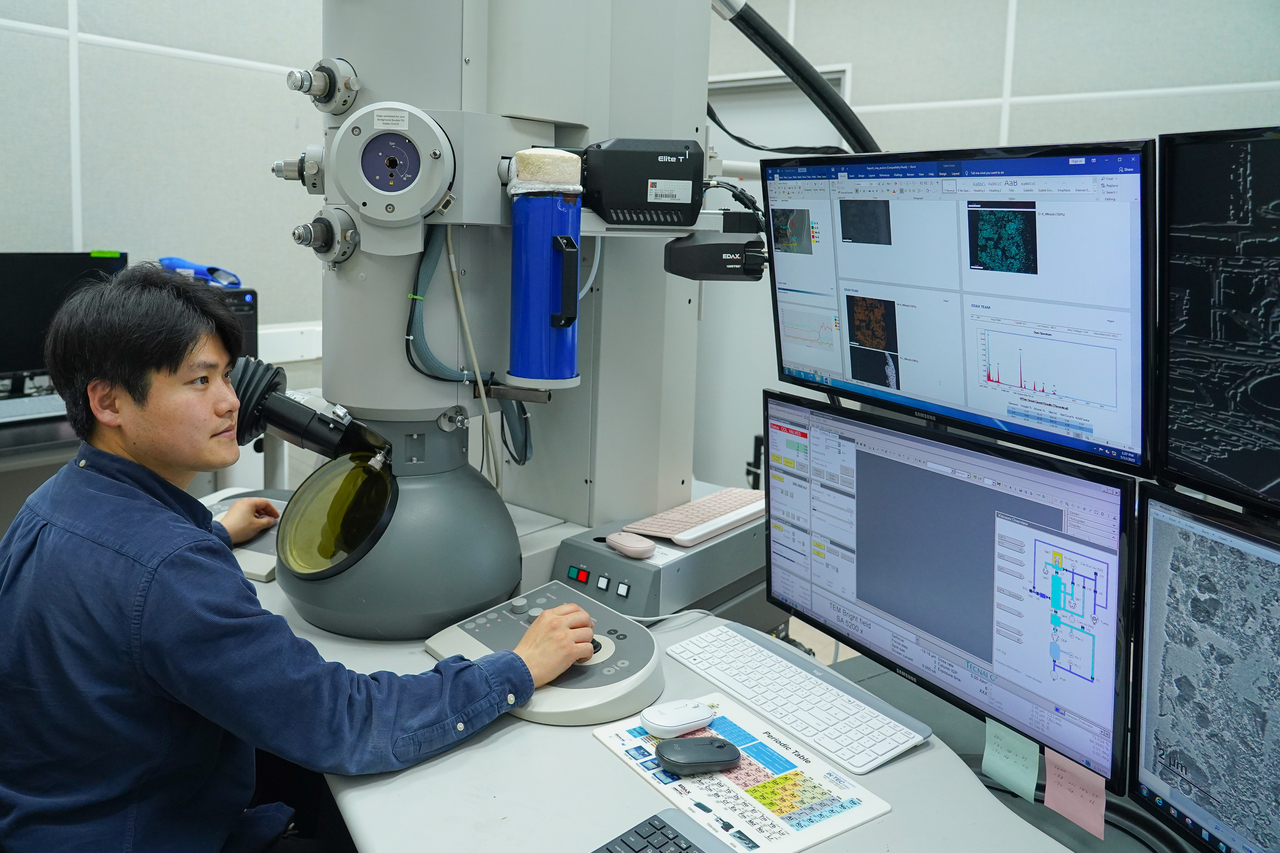 | 조용륜 박사가 투과전자현미경(TEM)을 이용해 시료의 미세 구조를 분석하고, 그 결과로 얻어진 고해상도 이미지와 조성분석 데이터를 확인하고 있다.[GIST 제공] |
