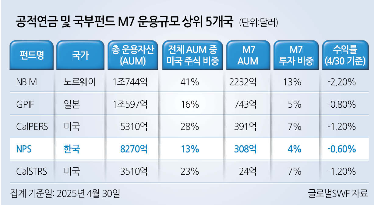 도널드 트럼프 미국 대통령발(發) 상호관세 충격으로 미 주식시장이 휘청여도 국민연금(NPS)의 미국 대형 기술주 ‘매그니피센트7(M7)’을 향한 애정은 식지 않았다. 지난 4월 말 기준 국민연금의 M7 총 운용자산(AUM) 순위는 전 세계 공적연금과 국부펀드를 통틀어서 4위(308억달러)다.