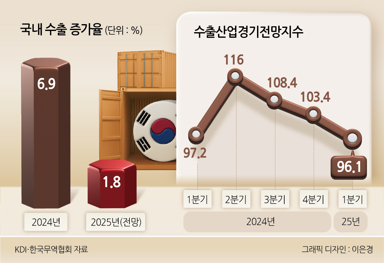 23일 KDI(한국개발연구원)와 한국무역협회 등에 따르면 올해 수출 증가율은 통상 환경 악화 여파로 1.8%에 그칠 것으로 전망된다. 지난해 6.9%와 비교하면 5.1%포인트 떨어진 수준이다. EBSI(수출산업경기전망지수)도 1분기 96.1로, 네 분기 만에 100 아래로 떨어졌다. EBSI가 100보다 낮다는 것은 다음 분기 수출 경기가 악화할 것으로 보는 수출기업이 그렇지 않은 곳보다 많다는 뜻이다.