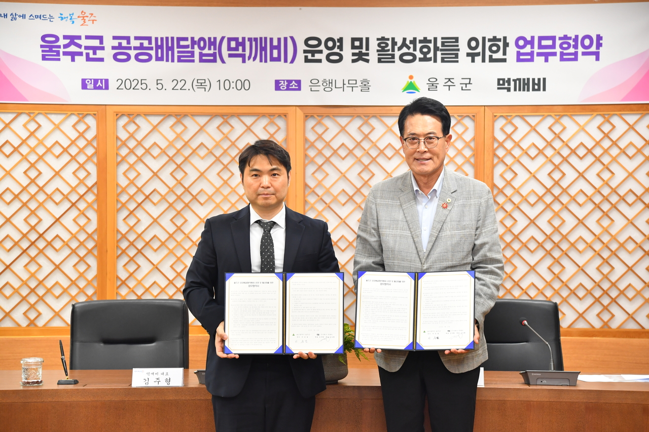 울주군과 먹깨비는 22일 공공배달앱 운영을 위한 업무협약을 맺고서 울주군은 군청 홈페이지와 SNS 등 채널을 통해 가맹점과 소비자를 대상으로 홍보하고, 먹깨비는 가맹점 모집과 현장 지원 등 운영 전반을 맡기로 했다.
