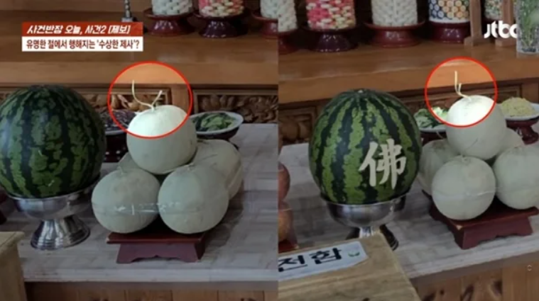 | 경남 한 사찰에서 올린 서로 다른 제사상을 찍은 사진. 멜론의 꼭지(원)가 똑같다. [JTBC ‘사건반장’ 갈무리] |