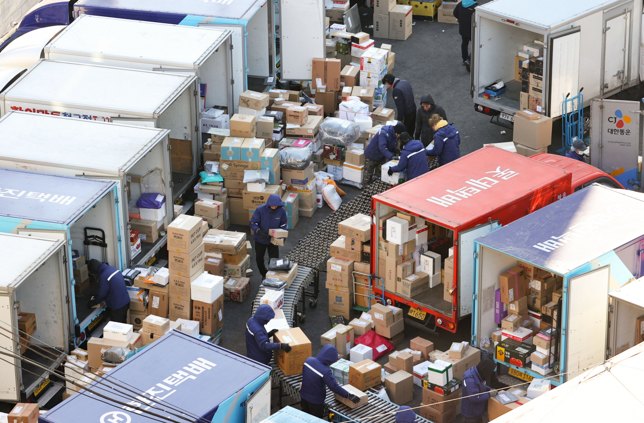 | 서울의 한 택배 물류센터에서 노동자들이 물품을 옮기는 모습. [연합] |