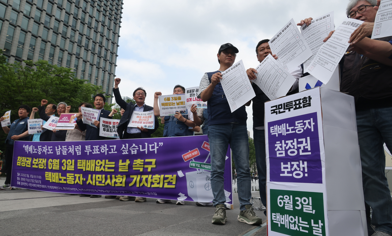 이번 대선일이 ‘택배 없는 날’이 된 것은 택배노조가 택배 노동자의 참정권을 보장해야 한다고 촉구한 데 따른 것이다. 최근 택배사들이 저마다 주7일 배송을 시작하는 등 경쟁이 치열해지며 택배노동자의 참정권마저 침해한다는 주장이다.