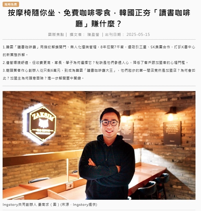 ㈜아이엔지스토리가 운영하는 ‘작심스터디카페’가 대만 대표 경제주간지 [비즈니스위클리(商業周刊)]에 성공적인 무인 스터디카페 프랜차이즈 사례로 소개되며, 기술 기반 무인 운영 모델로서의 경쟁력과 해외 시장에서의 영향력을 한층 더 강화하고 있다.
