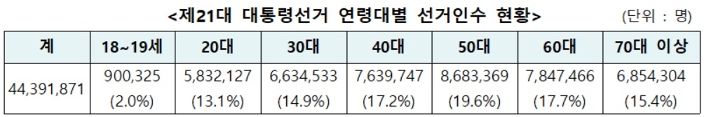 성별로 보면, 남성은 2197만7489명(49.5%), 여성은 2241만4382명(50.5%)으로 여성 유권자가 43만6893명 더 많은 것으로 나타났다.