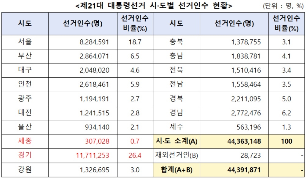 [헤럴드경제=이태형 기자]행정안전부는 오늘 6월 3일 치러지는 제21대 대통령선거의 선거인수가 선거인명부 확정일인 5월 22일 기준 총 4439만1871명이라고 23일 밝혔다.이 중 국내 선거인은 4413만3617명이고 외국에서 투표권을 행사하는 국외부재자신고인과 재외선거인은 25만8254명이다.