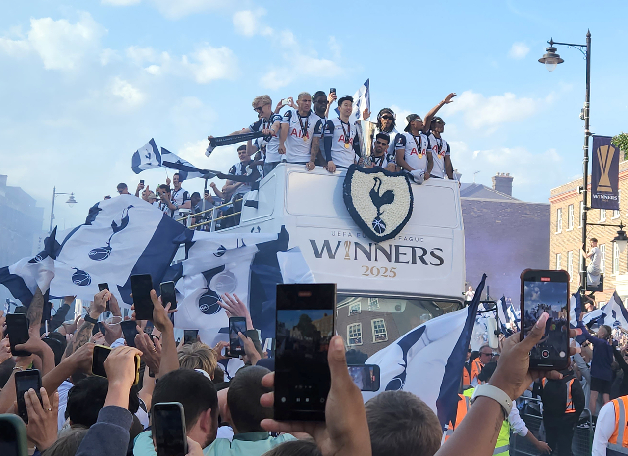 | 23일(현지시간) 영국 런던 토트넘 홋스퍼 스타디움 앞에서 열린 토트넘의 유럽축구연맹(UEFA) 유로파리그 우승 기념 퍼레이드에서 손흥민이 팬들에게 인사하고 있다. [연합] |