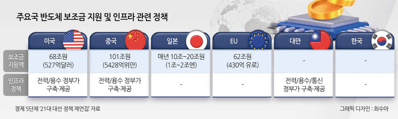 경제 5단체는 최근 21대 대선 정책 제언집을 통해 “반도체·디스플레이·이차전지 등 국가첨단전략산업에 대해 경쟁국 수준의 보조금·인프라 지원이 긴요하다”고 강조했다.