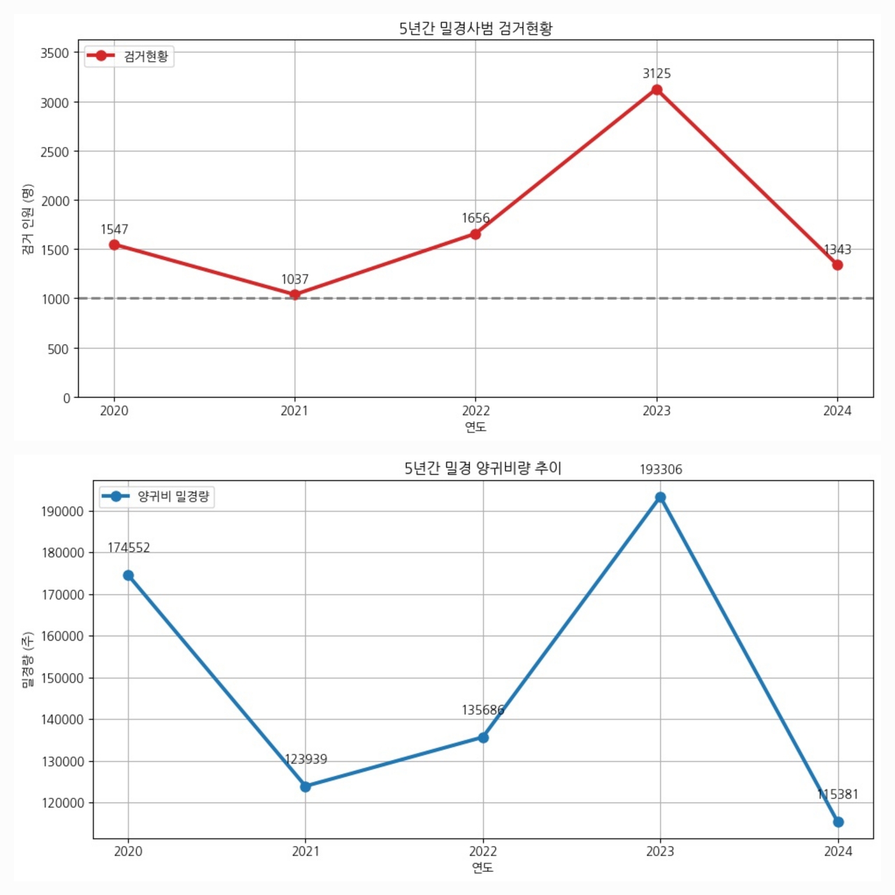 | 2024~2020년도 밀경사범 검거현황 과 밀경 양귀비량 추이. |