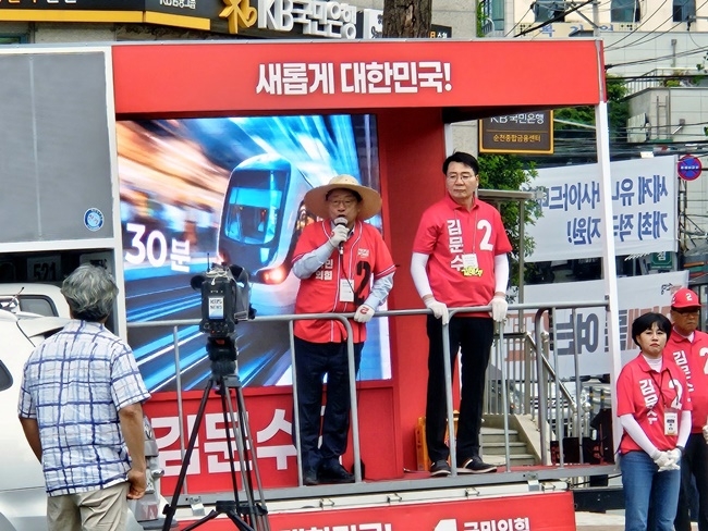 이정현 전 새누리당 대표는 이날 연향동 국민은행 사거리에서 열린 유세에서 “이번 대선에서 순천이 김문수 후보에게 30% 이상만 투표(득표)한다면 온 국민이 깜짝 놀랄 것이고 순천이 필요로 하는 정부 차원의 모든 예산지원이 파격적으로 이뤄질 것”이라며 본인의 상징인 ‘예산 폭탄론’을 끄집어냈다.